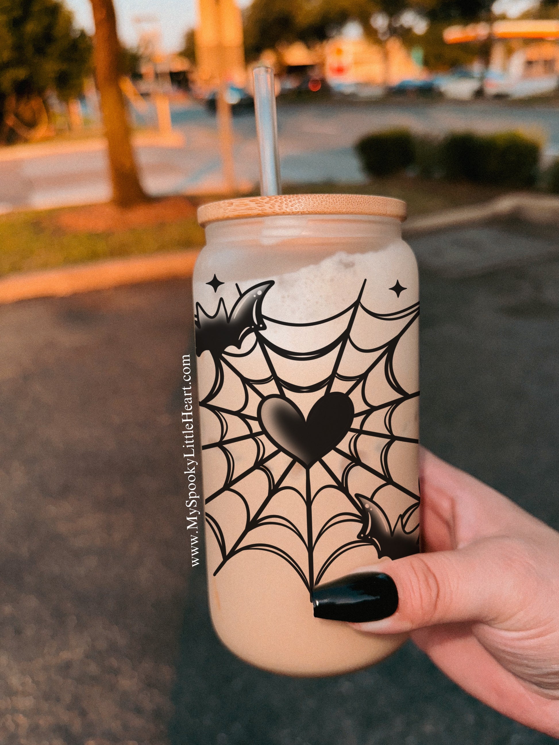 Heart Spiderweb with bats 16oz Frosted Glass Cup
