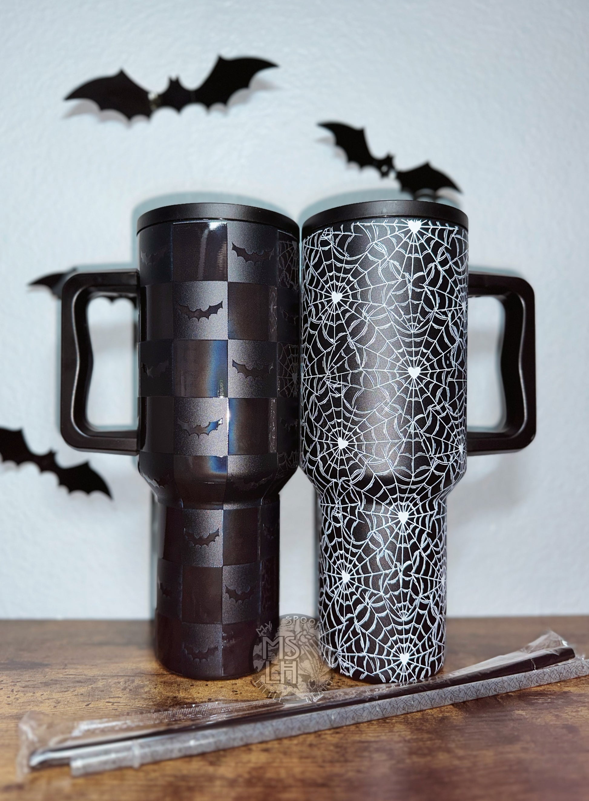 Spooky 40oz Tumbler with Straw | 40oz Checkered Bats Tumbler | White Web 40oz Tumbler